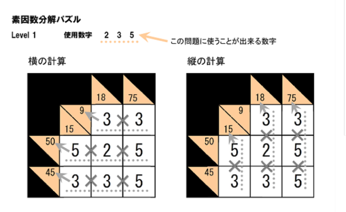 上の図のように、横のマスの数を掛け合わせた答えが左端の三角の中にある数、縦のマスの数を掛け合わせた答えが一番上の三角の中にある数になるように、すべてのマスに数字を埋めるパズルです。
